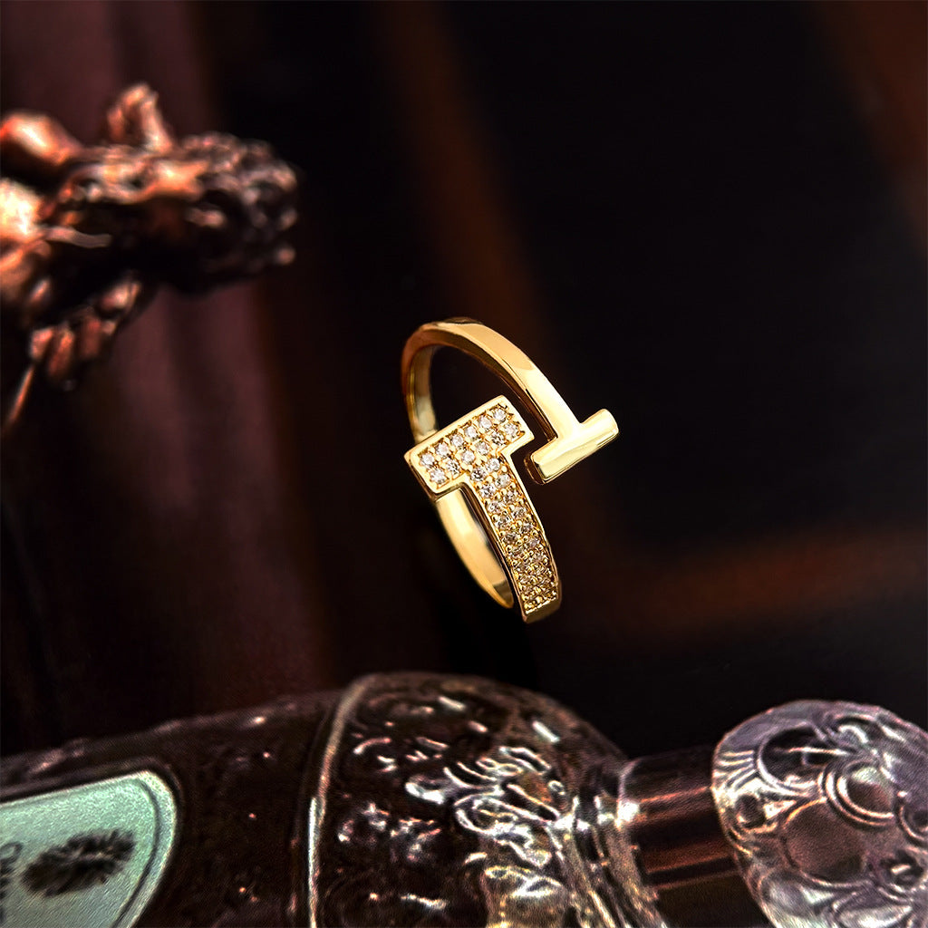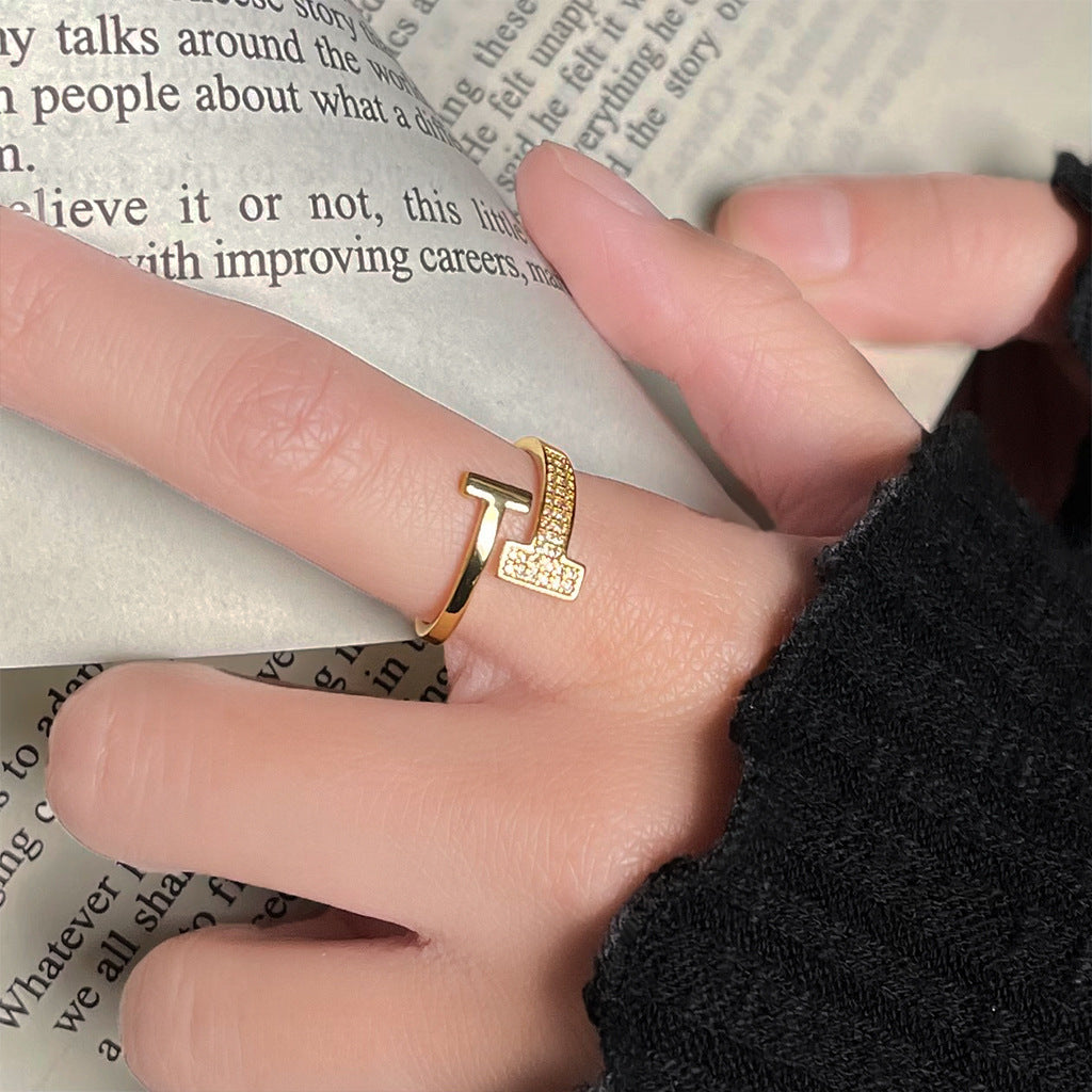 This open-ended gold-tone ring features a sleek geometric design, accented with rows of shimmering cubic zirconia for a refined yet modern look. The clean lines and adjustable fit make it perfect for stacking or wearing solo as a statement of understated elegance.