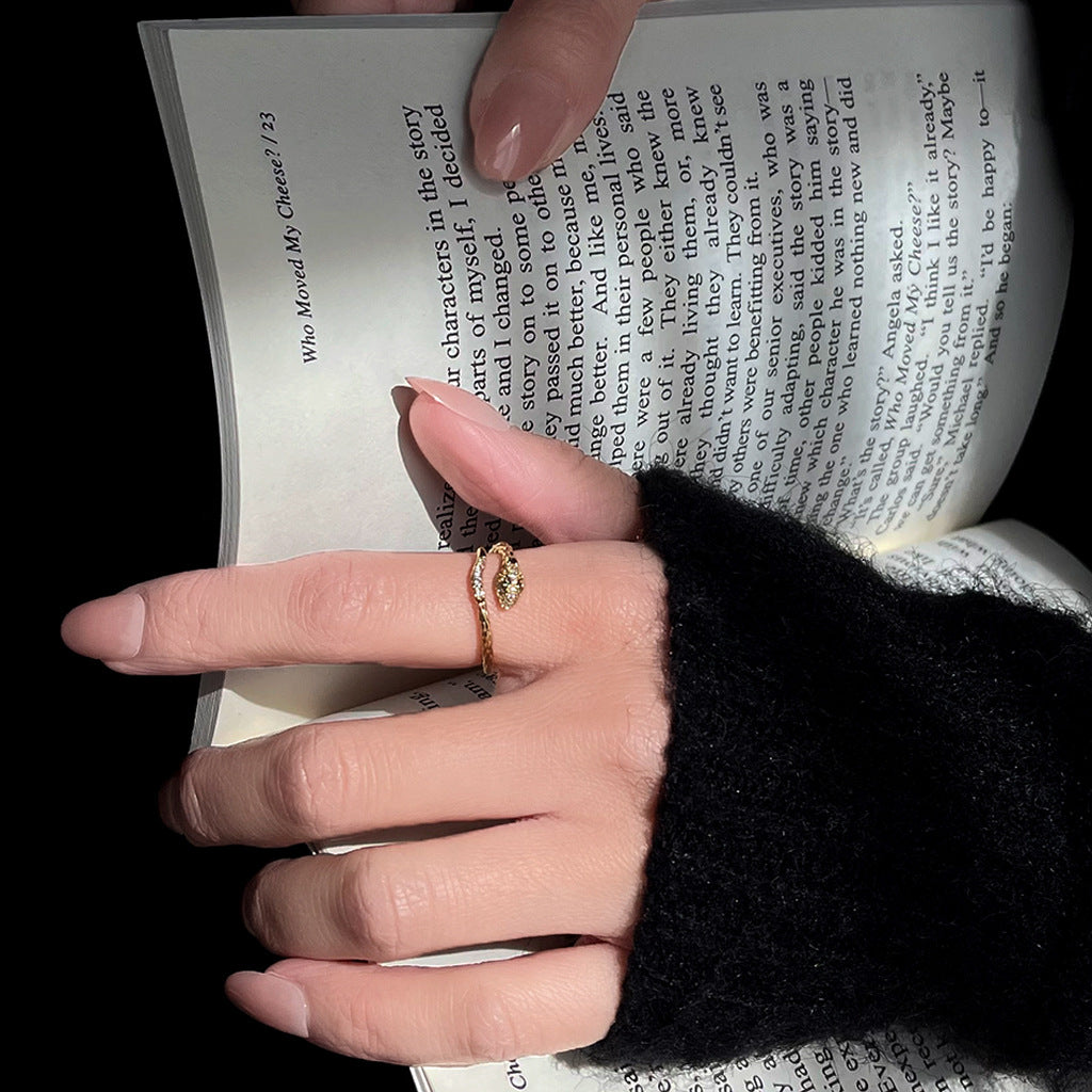 Crafted in polished copper with a 14K gold-plated finish, the ring coils gracefully around your finger, with shimmering pavé stones along its scaled body and vivid emerald-green eyes that captivate at every glance.