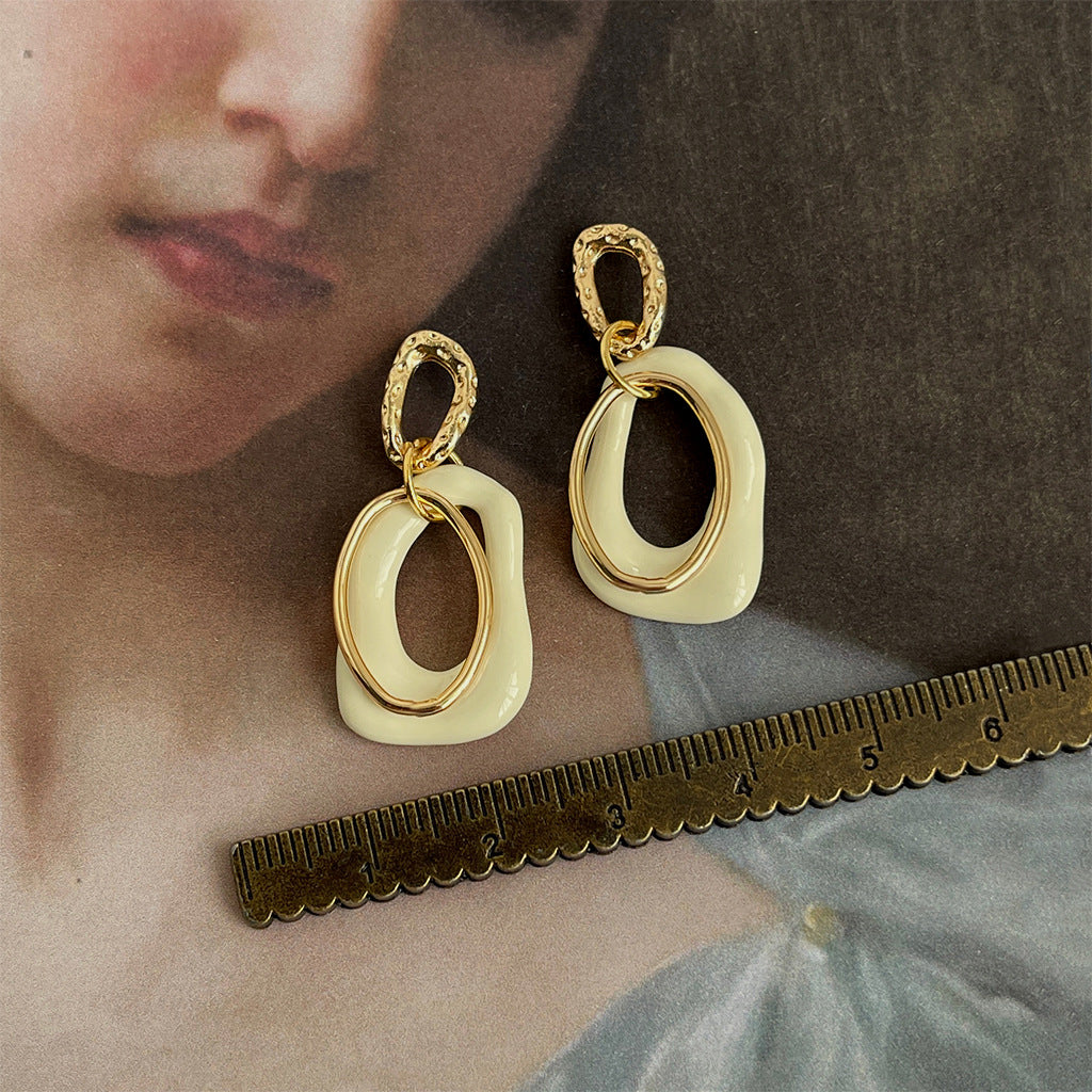 Featuring a sculptural double-loop design in ivory enamel with textured gold-tone accents, these earrings bring a touch of contemporary sophistication to any outfit. Lightweight yet bold, they’re perfect for both casual and dressy looks.