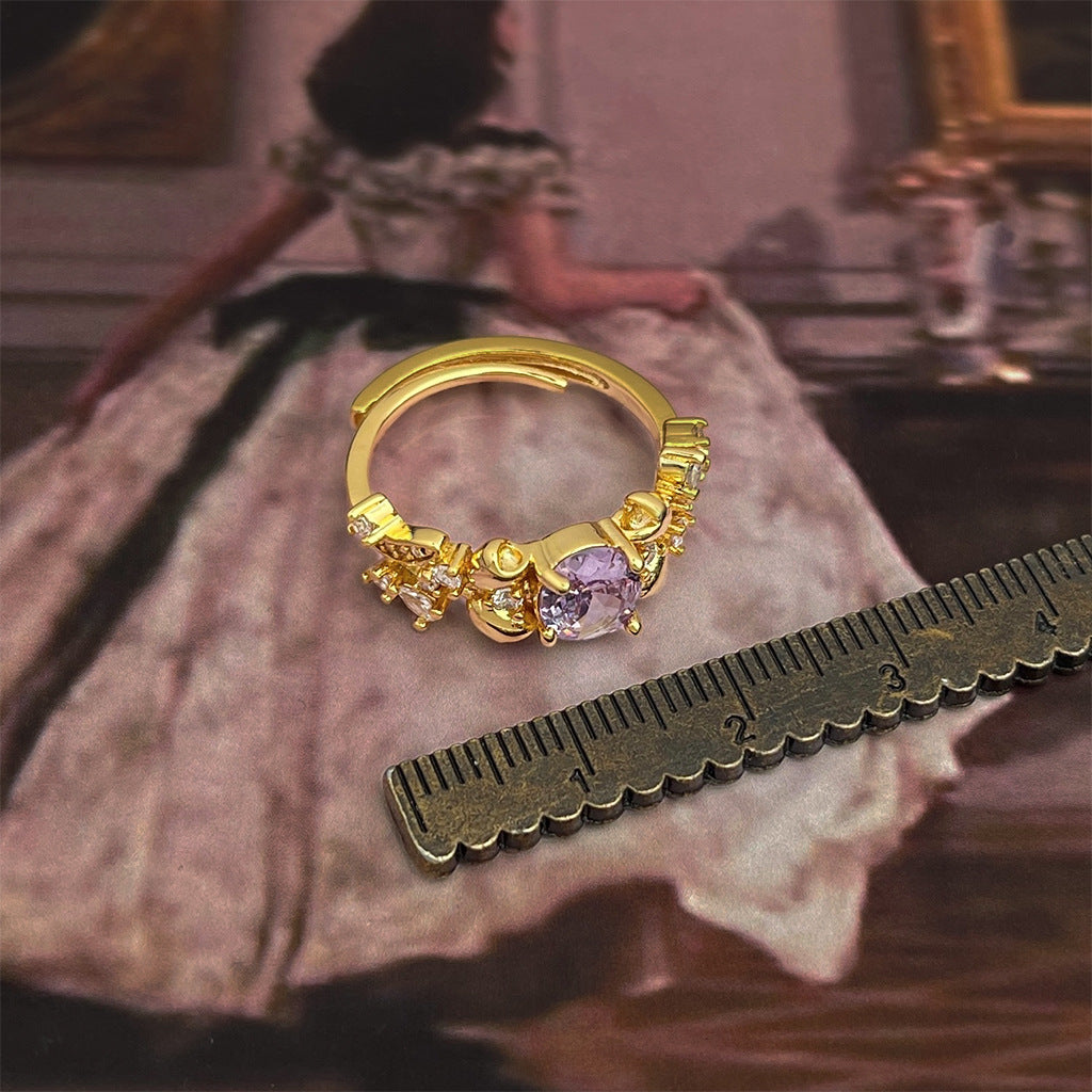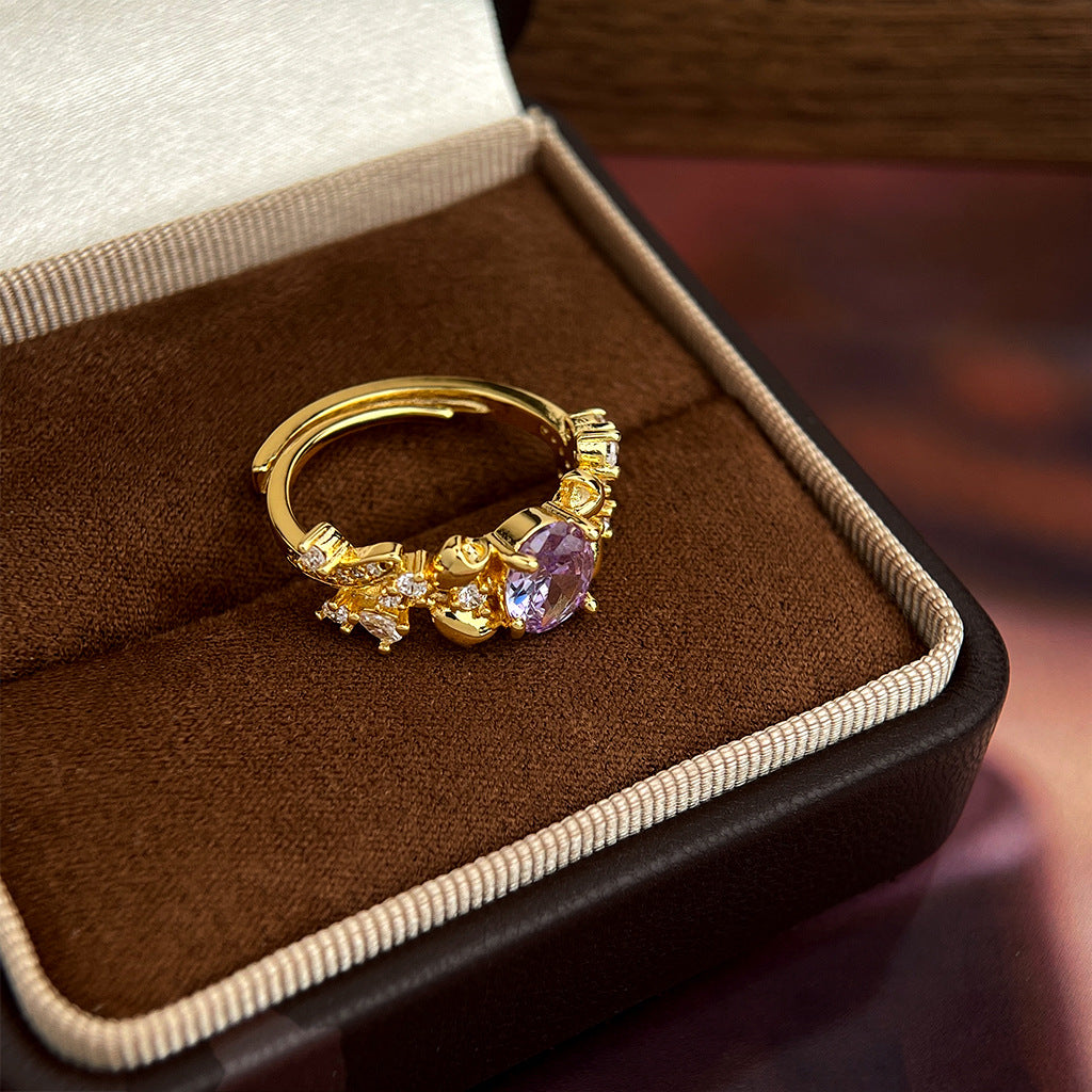 Crafted from polished copper, the ring features a dazzling oval-cut lavender cubic zirconia at its center, framed by intricate floral-inspired settings and shimmering clear stones.