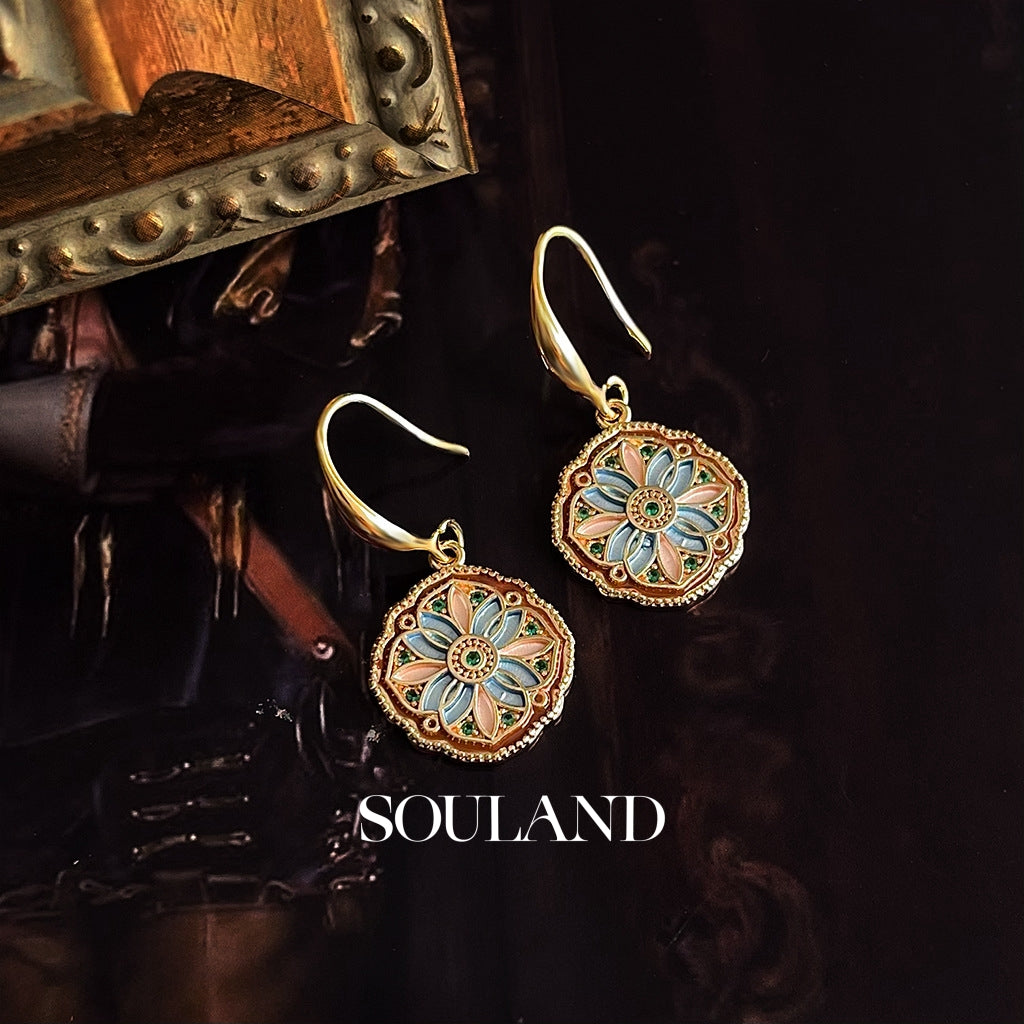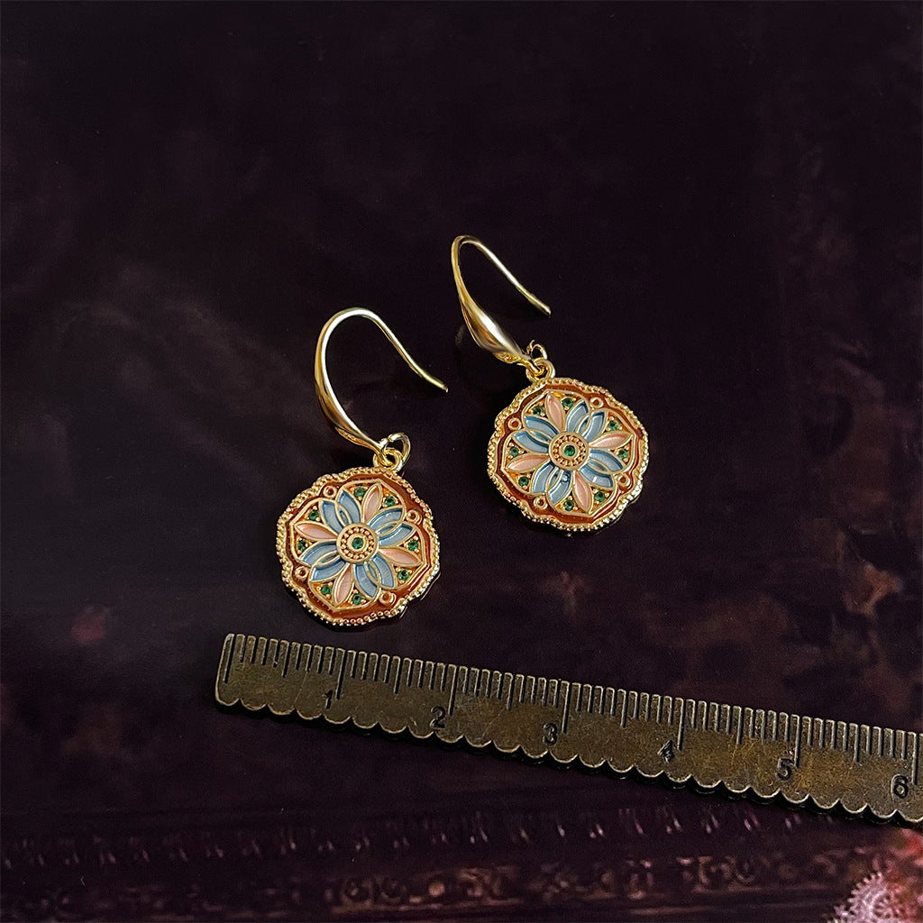 A delicate fusion of color and craftsmanship, these earrings feature a vintage-inspired mandala design adorned with soft pastel enamel petals and shimmering accents.