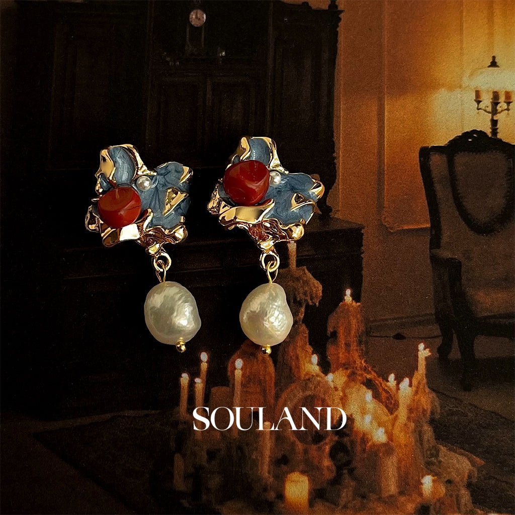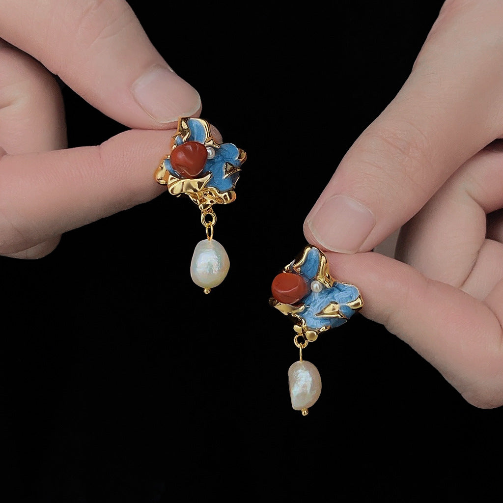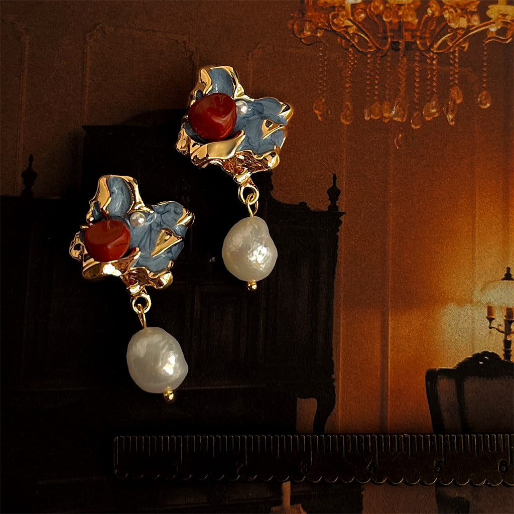 The irregular abstract metal frame blends splashes of deep blue and fiery red, accented with a luminous faux pearl, while a baroque freshwater pearl dangles below for a dramatic, one-of-a-kind finish.